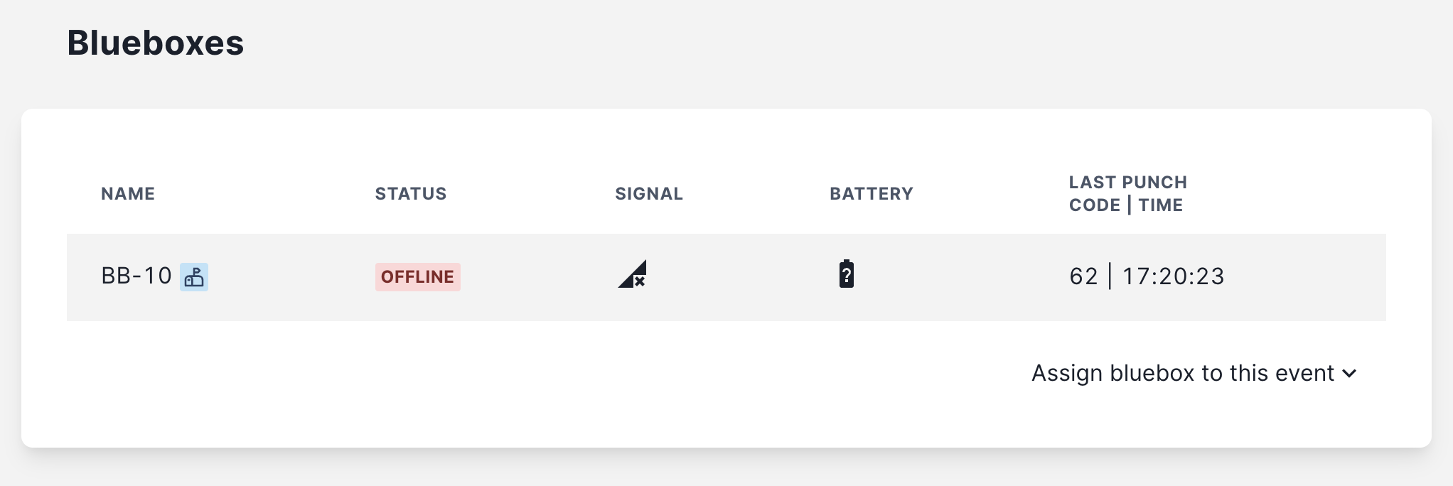 You can also monitor the status of your Blueboxes during your event, including signal strength, battery charge and the last recorded punch on the device.